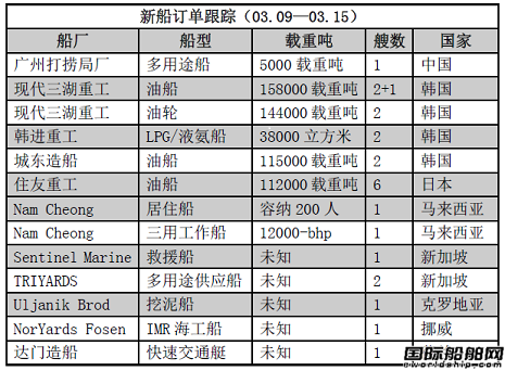 據國際船舶網跟蹤:2015年03月09至03月15日,全球船廠共接獲23+1艘新船訂單。其中,中國船廠共獲得1新船訂單;韓國船廠共獲得8+1艘新船訂單;日本船廠共獲得6艘新船訂單;馬來西亞船廠共獲得2艘新船訂單;新加坡船廠共獲得3艘新船訂單;克羅地亞、挪威和荷蘭國家的船廠也獲得了相應新船訂單。