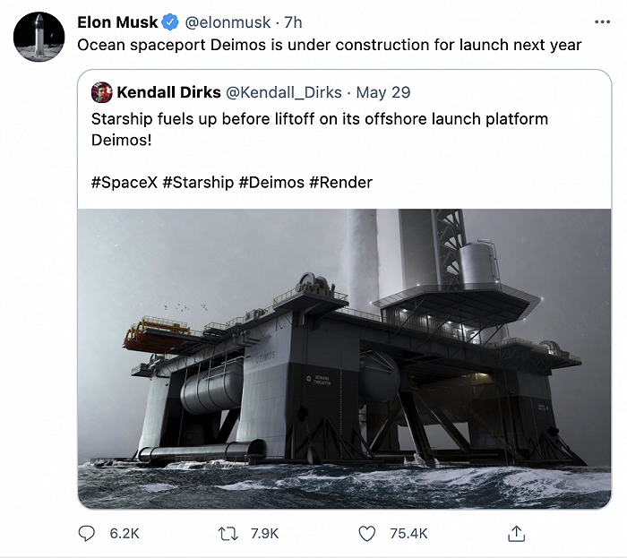 5月31日,埃隆•馬斯克在推特上表示,“Deimos”號(火衛(wèi)二)海上發(fā)射平臺目前正在建設(shè)中,預(yù)計將在2022年開始執(zhí)行發(fā)射任務(wù)。這一預(yù)期比他在年初預(yù)估的2021年底有所推遲。