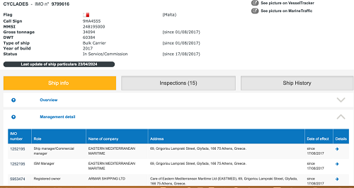航運公開數據庫Equasis顯示,“Cyclades”輪注冊船東為希臘Armar Shipping Ltd,ISM/船舶/商業管理公司均為希臘Eastern Mediterranean Maritime。