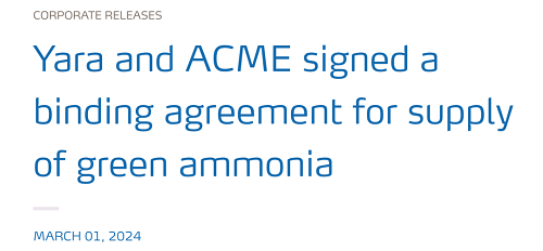 3月1日,挪威氨生產(chǎn)商雅苒(Yara)與印度可再生能源公司Acme Cleantech全資子公司GHC SAOC簽署了一份可再生氨長期供應(yīng)協(xié)議。