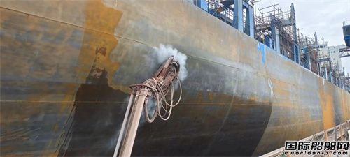 在塢內(nèi)外板扒皮過程中,施工團隊面臨了諸多挑戰(zhàn)。連續(xù)的陰雨天氣給施工帶來了極大不便,同時干舷及底部局部區(qū)域機器人難以觸及,這也增加了施工難度。然而,面對緊迫的船期,晚一天出塢就意味著晚一天開船,這給施工團隊帶來了巨大的壓力。