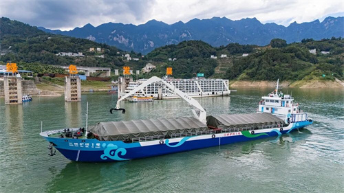 8月20日,國內(nèi)首艘4E級純電動清漂轉(zhuǎn)運船“三峽護壩1號”在三峽庫區(qū)水域試航。(彭強 攝)