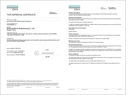 Recently, the D-VesselKeeper Ship Management Platform, independently developed by Winkong Marine Engineering Co., Ltd., has once again achieved a significant milestone. Following its receipt of China Classification Society (CCS) Type Approval Certificate for Ship Machinery Planned Maintenance System (Software) and ClassNK Innovation Endorsement Certificate, it has now officially obtained the DNV Type Approval Certificate for Planned Maintenance System (PMS).