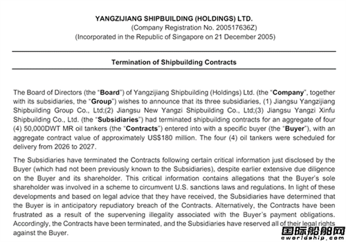 公告顯示,江蘇揚子江船業(yè)集團有限公司、江蘇新?lián)P子造船有限公司、江蘇揚子鑫福造船有限公司三家公司共同決定,終止與特定買方簽訂的4艘MR型成品油船訂單,保留對買方的所有法律權利。終止合同的理由是“在買方近日披露的某些關鍵信息中,顯示其唯一股東涉嫌參與規(guī)避美國制裁法律法規(guī)的行為”。