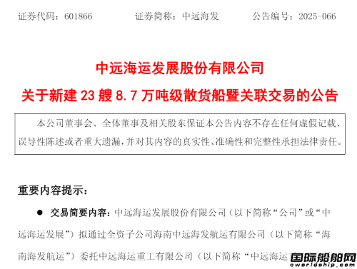 10月31日,中遠(yuǎn)海發(fā)宣布,擬通過(guò)全資子公司海南中遠(yuǎn)海發(fā)航運(yùn)有限公司委托大連中遠(yuǎn)海運(yùn)重工有限公司建造23艘8.7萬(wàn)噸級(jí)散貨船,交易總金額人民幣73.37億元,單船船價(jià)為人民幣3.19億元(不含稅),預(yù)計(jì)首船將于2027年5月20日或更早的時(shí)間交付(不含稅),其他陸續(xù)于2028年底前交付。