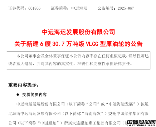 同日,中遠(yuǎn)海發(fā)還宣布,擬通過(guò)海南中遠(yuǎn)海運(yùn)發(fā)展有限公司委托中國(guó)船舶集團(tuán)有限公司所屬大連船舶重工集團(tuán)有限公司建造6艘30.7萬(wàn)噸級(jí)VLCC,交易總金額人民幣50.858億元(不含稅),單船船價(jià)為人民幣8.478億元(不含稅)。其中首艘船計(jì)劃于2027年4月份開(kāi)始交付,后期船舶將陸續(xù)于2028年11月底前完成交付。