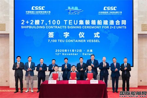 11月12日,大連造船聯(lián)合中船貿(mào)易公司與越南海安綠色航運(yùn)公司簽署2+2艘7100TEU集裝箱船訂單。越南海安公司董事長Vu Thanh Hai、總經(jīng)理Nguyen Ngoc Tuan,大連造船董事長韓東望、副總經(jīng)理何旭參加儀式。