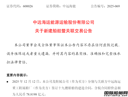 12月12日晚間,中遠海運能源運輸股份有限公司宣布,與關聯方中遠海運重工附屬船廠簽訂19艘船舶建造合同,含稅合同船價總額為人民幣78.8198億元,連同建造期利息、監造費等資本化費用的總投資約為81.24億元。