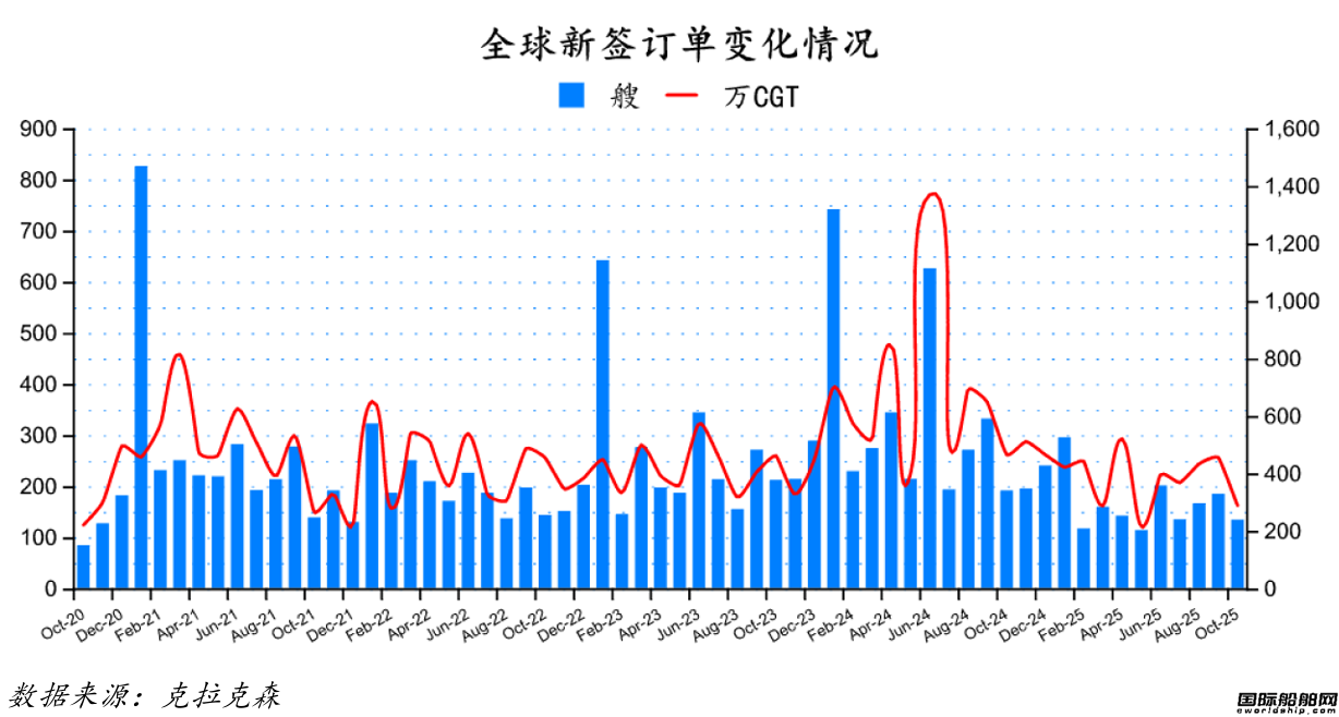 2025年10月份全球新簽訂單134艘,共計2920231CGT。與2025年9月份全球新簽訂單185艘,共計4590913CGT相比較,數量環比減少51艘,修正總噸環比下降36 39%。與2024年10月份全球新簽訂單191艘,共計4676633CGT相比較,數量同比減少57艘,修正總噸同比下降37 56%。...
