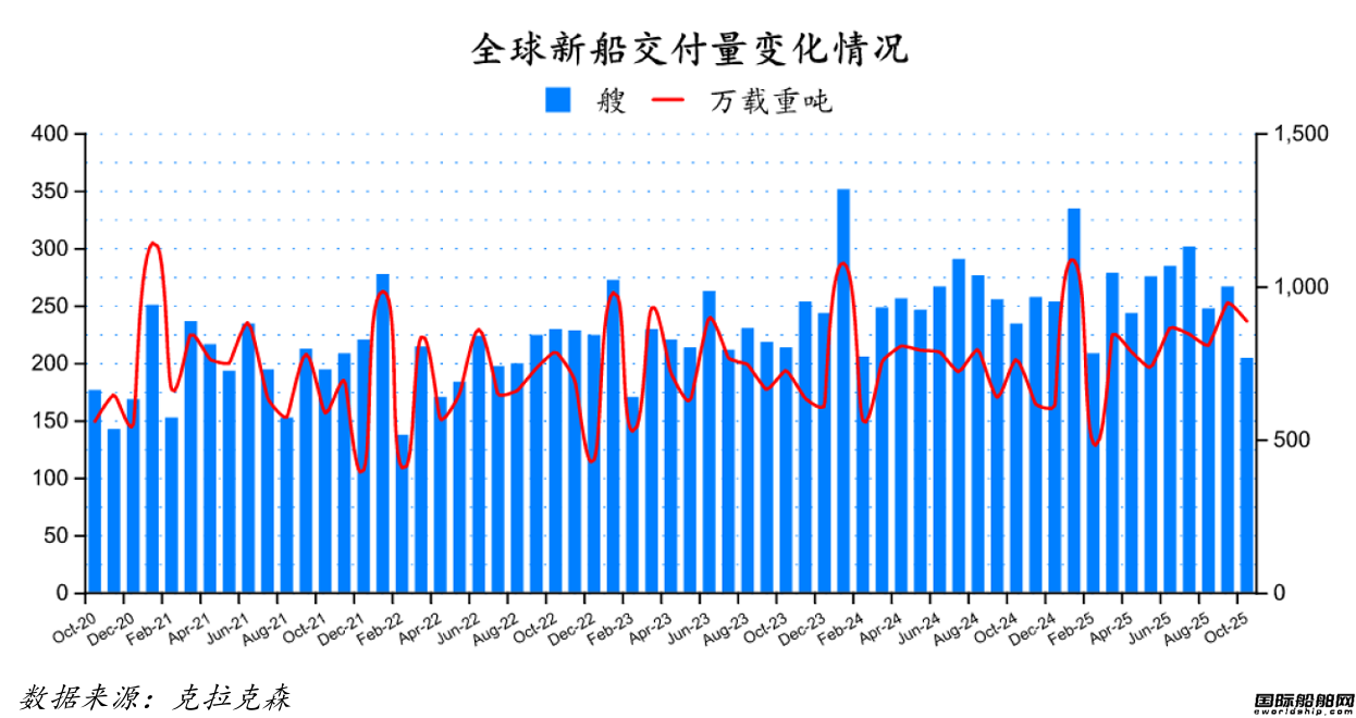 2025年10月份全球船廠共交付新船204艘,共計8,890,301載重噸。與2025年9月份全球新船交付訂單266艘,共計9,491,231載重噸相比較,數量環比下降23.31%,載重噸環比下降6.33%。與2024年10月份全球船廠共交付新船234艘,共計7,641,594載重噸相比較,數量同比下跌12.82%,載重噸同比上升16.34%。