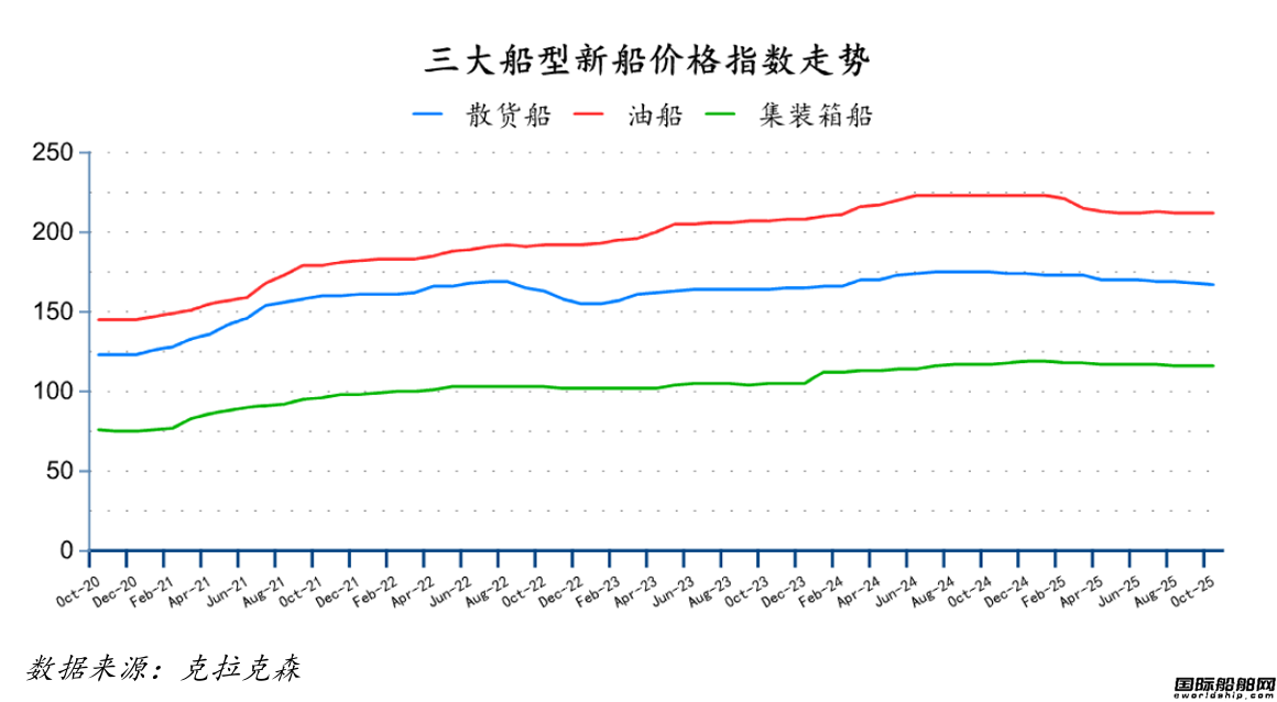 10月份散貨船新船價格指數環比下跌1點,為167點;油船和集裝箱船新船價格指數環比均持平,分別為212點、116點。