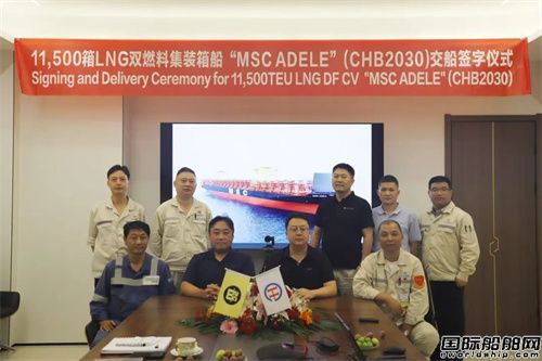 同日下午14時50分,長宏國際為地中海航運(MSC)建造的第4艘11500TEU雙燃料LNG動力集裝箱船“MSC ADELE”號(CHB2030)通過視頻連線方式成功簽字交付,較合同交期提前74天。