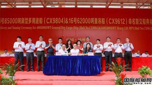 9月11日,中船集團旗下中船澄西船舶修造有限公司為中信金融租賃有限公司建造的4號84500噸干散貨船“CSPC LEO(中信獅子座)”輪和為交銀金融租賃有限責任公司建造的16號62000噸重吊多用途船“安福”輪在中船澄西揚州公司同日命名交付。