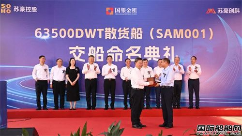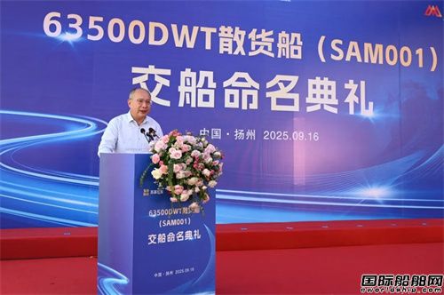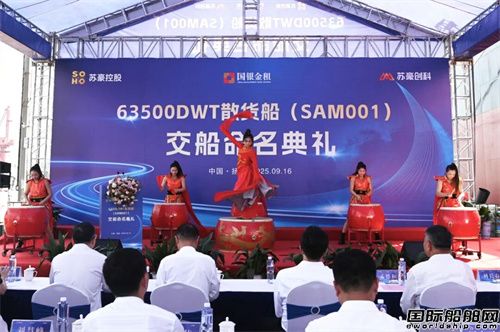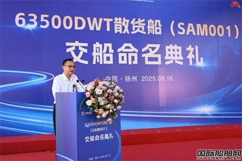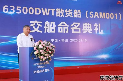 蘇豪創科集團黨委書記、董事長周安主持典禮。周安介紹,蘇豪創科作為蘇豪控股集團的重要子企業,自2024年重組成立以來,堅定瞄準“百億創科”目標,緊抓船舶市場復蘇機遇,積極爭取訂單、拓展市場、優化產品。本次交付的63500散貨船一號船由上海船舶研究設計院設計,為單機單槳驅動散貨船,型長199.9米,型寬32.26米,型深18.9米,結構吃水13.5米,服務航速13.4節,最大續航達20000海里,在綠色、環保和節能等方面表現優異,屬于當前國際船舶市場主流明星船型之一。該船是蘇豪創科重組后首艘自營出口船舶,自項目啟動以來,創科船廠通過科學規劃與精準管理,克服高溫酷暑等困難,在確保建造質量的同時,創造了提前44天交付的佳績,充分彰顯了船舶制造的“蘇豪速度”和“蘇豪品質”。