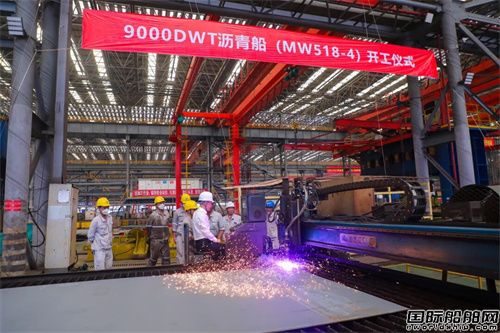 上午,馬尾造船建造的9000DWT瀝青船(MW518-4)順利開工,其第一塊鋼板在激光切割中火花四濺,象征著新船建造正式拉開帷幕。