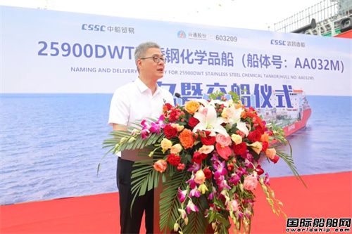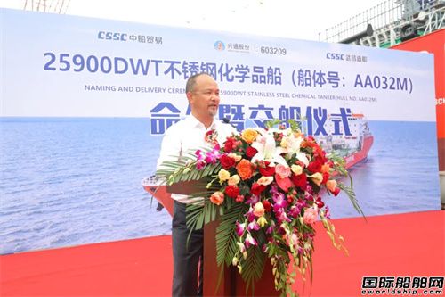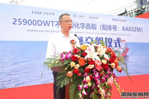 9月26日上午,中國船舶集團(tuán)集團(tuán)武昌造船聯(lián)合中船貿(mào)易為興通海運(yùn)股份有限公司建造的首艘25900DWT不銹鋼化學(xué)品船“興通海獅(XT SEA LION)”輪在江蘇靖江舉行命名暨交船儀式。