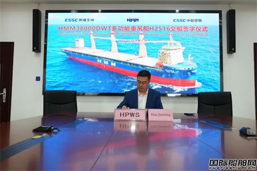 9月26日,中船黃埔文沖船舶有限公司聯(lián)合中國船舶工業(yè)貿(mào)易有限公司 (CSTC) 為韓國最大航運(yùn)公司韓新海運(yùn)(HMM)建造的38000噸多功能重吊船首制船“HMM Narae”號(H2516)在廣州、上海、首爾三地通過云交付的形式,順利完成交船文件簽署。同日,該系列船3號船H2518成功下水,實(shí)現(xiàn)“交付+下水”雙節(jié)點(diǎn)無縫銜接。