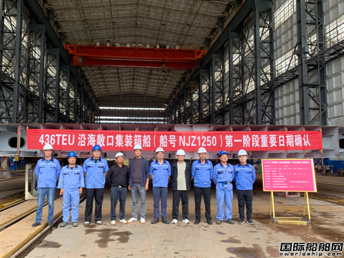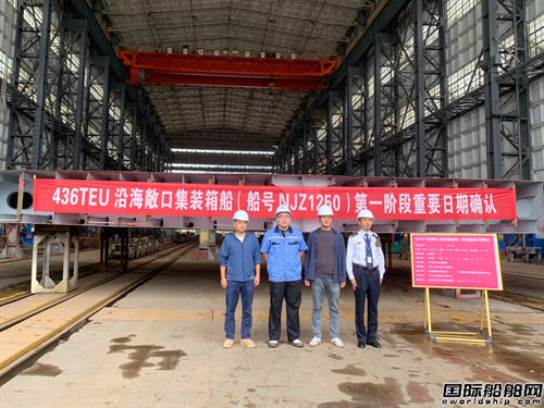 2025年10月16日10時28分,新江洲船舶重工有限責任公司承建436TEU沿海敞口集裝箱船(船號NJZ1250)鋪龍骨四方見證儀式在303室內船臺舉行。駐場船東屠常奎、朱亮,新江洲船舶重工副總經理楊柳、總經理助理馮唐西,九江海事局、九江船檢代表,項目經理何鵬程、賀勇及相關部門負責人出席儀式,共同見證該項目從分段制造階段邁入船臺總裝的核心節點。