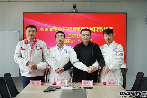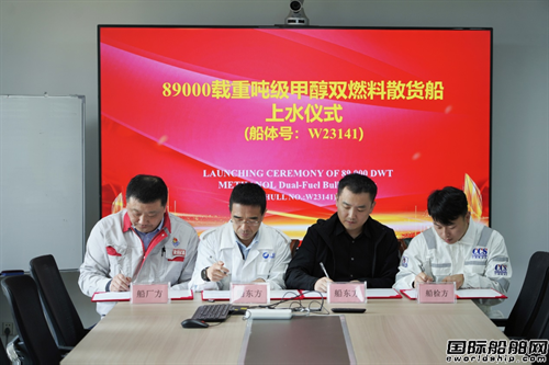 10月28日,蕪湖造船廠為國航遠洋建造的首艘89000載重噸甲醇雙燃料散貨船(船體號:W23141)在威海基地順利舉行下水儀式。