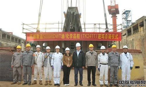 10月27日,環球散運訂造的50000DWT油/化學品船(TK2411)進塢合攏。該型船總長182.75 米,型寬32.20米,型深19.10米,設計吃水11.00米,設計航速14.5節,入級LR。