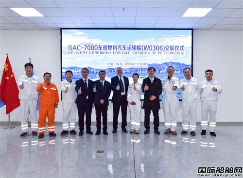 11月24日,招商工業威海船廠為GAC船東建造的首艘7000車雙燃料汽車運輸船“GLOBAL ACONCAGUA”(W0306)完工交付。GAC船東和公司代表分別在交付文件上簽字。
