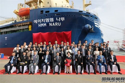 11月27日,黃埔文沖為韓國最大航運公司韓新海運(HMM)建造的38000噸多功能重吊船2號船“HMM NARU”輪,在龍穴廠區舉行命名儀式。