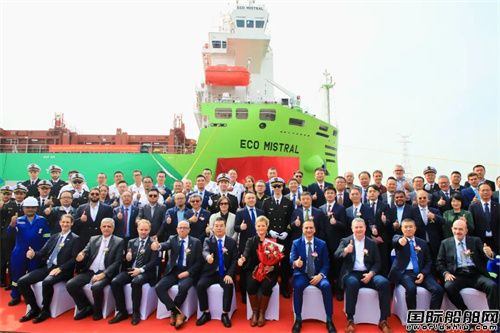 11月27日,黃埔文沖為新加坡Xpress Feeders集團建造的1250TEU甲醇雙燃料敞口集裝箱船4號船“ECO MISTRAL”輪,在文沖廠區舉行命名儀式。