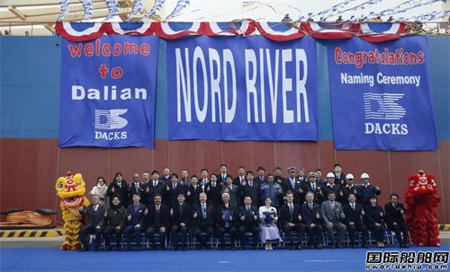11月27日,大連中遠海運川崎為丹麥NORDEN航運公司建造的第六艘6.4萬載重噸散貨船“NORD RIVER”輪(DE164)舉行命名儀式。
