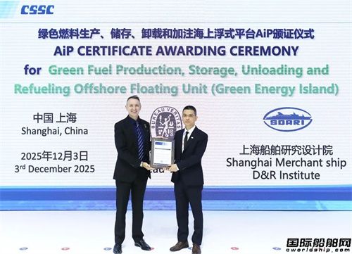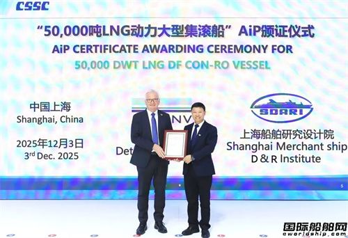 在 2025 中國國際海事會展(Marintec China 2025)上,中船集團上海船舶研究設計院(SDARI)自主研發(fā)的三大船型——27500箱超大型綠色雙燃料集裝箱船,綠色燃料生產(chǎn)、儲存、卸載和加注海上浮式平臺(綠色能源島),50000噸LNG動力集滾船獲得來自三大船級社頒發(fā)的原則性認可(AiP)證書。