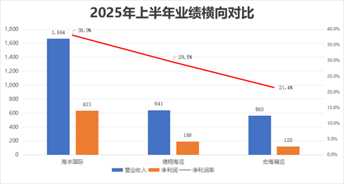 特別值得一提的是,就凈利潤增速而言,2025年上半年,德翔海運凈利潤同比增長219.8%,領(lǐng)先于所有同行;宏海箱運則以同比增長148.3%緊隨其后。