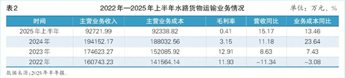 本刊留意到,寧波海運(yùn)“量增利減”的情況已持續(xù)多年。根據(jù)表1數(shù)據(jù),2022年以來,寧波海運(yùn)的水路貨物運(yùn)輸收入規(guī)模持續(xù)擴(kuò)張,收入曲線由2022年的20.73億元抬升至2024年的24.32億元,今年上半年同比增長11.33%。