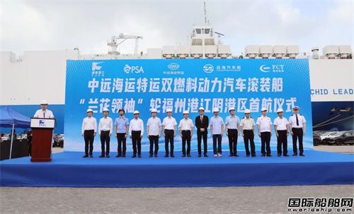 “蘭花領袖”輪福州港江陰港區首航儀式上,來自福建省福州港口發展中心、福州市交通運輸局、福州江陰港城經濟區管委會、福州港務集團有限公司、福建八方物流股份有限公司、榕城海關駐福清辦事處、福清出入境邊防檢查站、福州海事局福清海事處、東南(福建)汽車工業股份有限公司等有關單位負責人出席活動。廣州遠海汽車船運輸有限公司總經理朱桂華出席并致辭。