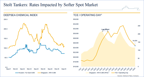 “由于地緣政治的持續(xù)波動(dòng),Stolt Tankers的收益進(jìn)一步減弱,日均TCE下降了26%,降至24838美元,而去年同期則創(chuàng)下歷史新高。”