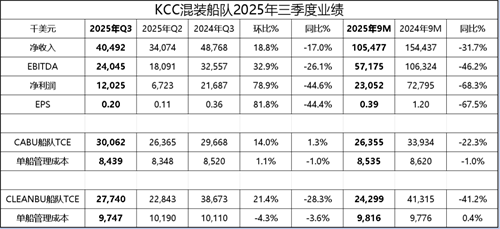 2025年前三季度,KCC混裝船隊(duì)實(shí)現(xiàn)凈收入1.0億美元,同比減少31.7%;EBITDA達(dá)到5717.5萬(wàn)美元,同比減少46.2%;凈利潤(rùn)為2305.2萬(wàn)美元,同比減少68.3%。