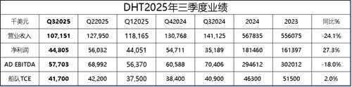 具體而言,2025年三季度,DHT實現(xiàn)營業(yè)收入1.1億美元,同比減少24.1%;調整后的息稅折舊攤銷前利潤(EBITDA)為5770.3萬美元,同比減少18.0%;凈利潤為4480.5萬美元或每股0.28美元,同比增長27.3%。