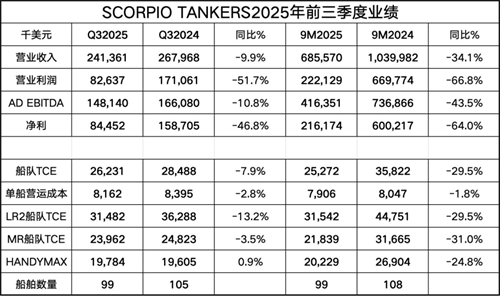 2025年前三季度,天蝎座油輪實現營業收入6.8億美元,同比下降34.1%;營業利潤達到2.2億美元,同比下降66.8%;調整后的EBITDA達到4.2億美元,同比下降43.5%;凈利潤達到2.2億美元,同比下降64.0%。