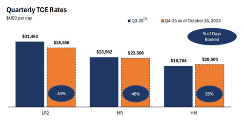 對于2025年四季度,天蝎座油輪預計LR2船隊現貨市場日租金達到28500美元,已經鎖定44%的營運日收入;MR船隊現貨市場日租金達到23500美元,已經鎖定46%營運日收入;Handymax船隊現貨市場日租金達到20500美元,已鎖定35%營運日收入。