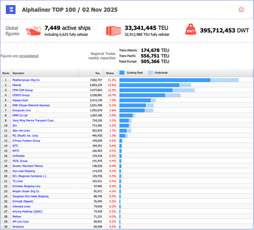 Alphaliner數據顯示,截至2025年11月2日,全球集裝箱船隊規模達到7449艘,運力3334.1萬TEU。