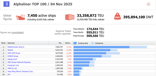 MSC是全球最大的班輪公司。Alphaliner最新數據顯示,該公司目前共運營955艘船舶,總運力超過700萬TEU,市場占有率高達21.2%,穩(wěn)居全球第一。其中,自有船舶688艘、租入船舶267艘,合計運力約700.3萬TEU。此外,MSC手中仍握有124艘新造集裝箱船訂單,總計新增運力約217.4萬TEU,顯示其在全球運力版圖上的擴張勢頭依舊強勁。