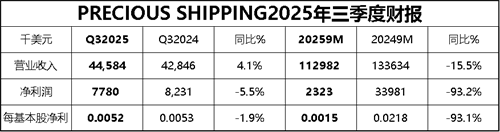 具體而言,2025年三季度,珍寶航運實現(xiàn)營業(yè)收入4458.4萬美元,同比增長4.1%;凈利潤為778.0萬美元或每基本股0.0052美元,同比下降5.5%。