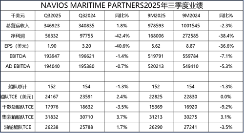 航運界網消息,多元化發展的Navios Maritime Partners L.P.(以下簡稱“Navios Partners”)在11月18日發布2025年三季度和前三季度財報。