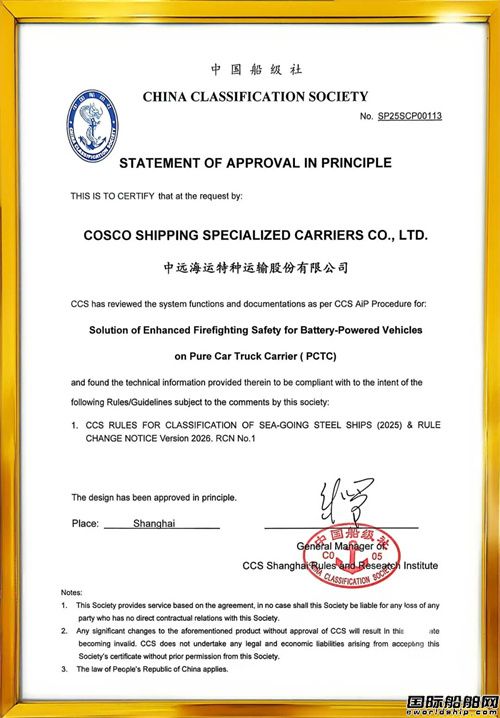 2025年12月2日,在被譽為“全球海事業風向標”的2025年中國國際海事會展(Marintec China 2025)系列活動中,中遠海運特運旗下遠海汽車船公司獲中國船級社(CCS)頒發《滾裝運輸鋰電池電動汽車增強消防安全技術要求》首張原則性認可(AIP)證書。這標志著中國在新能源汽車海運安全技術領域實現重要突破,以領先的船舶消防系統設備布置與安全管理體系,為蓬勃發展的新能源汽車出口構建起高標準、高可靠性的運輸保障。