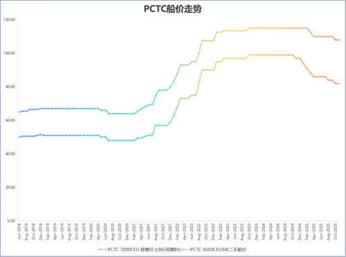 1艘標準設計5年船齡,6500CEU的PCTC目前的價值約為8200萬美元,較去年同期下降了約17%。