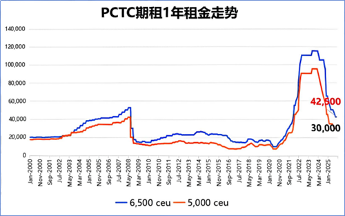 6500CEU汽車船期租一年的租金穩定在約42500美元/天。