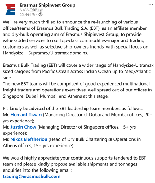 根據益洋航運官方社交媒體的聲明,作為 Erasmus Shipinvest 集團的附屬成員和運營機構,EBT 將為公司一流的大宗商品貿易客戶以及部分船東合作伙伴提供增值服務。EBT旗下多個辦事處/團隊已重新啟動運營,業務重點業務重點瞄準靈便型、超靈便型及極靈便型船市場,并覆蓋太平洋、印度洋乃至地中海/大西洋等主要航線。