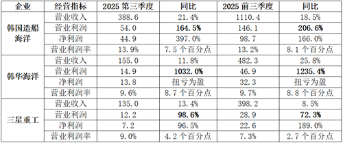 表1 韓國三大船企2025年三季度經(jīng)營業(yè)績(億人民幣)數(shù)據(jù)來源:韓國三大船企企業(yè)財報,中國船舶集團經(jīng)濟研究中心整理。