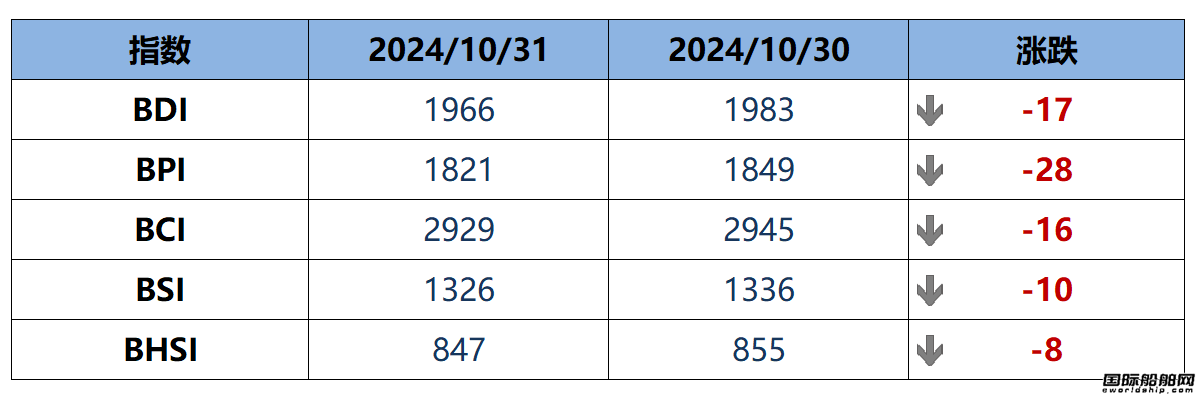 國際船舶網10月31日消息,波羅的海干散貨運價指數(BDI)周五下跌17點,或環比下降0.86%至1966點。波羅的海好望角型散貨船運價指數(BCI)下降16點,或環比下降0.54%至2929點。波羅的海巴拿馬型散貨船運價指數(BPI)下降28點,或環比下降1.51%至1821點。波羅的海超靈便型散貨船運價指數(BSI)下降10點,或環比下降0.75%至1326點。波羅的海靈便型散貨船運價指數(BHSI)下降8點,或環比下降0.94%至847點。