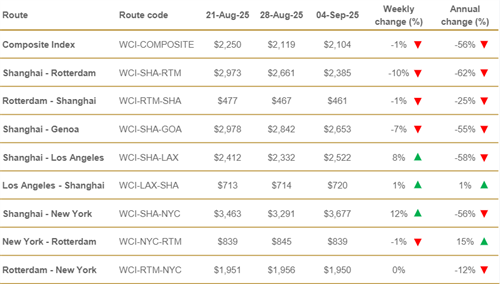 Drewry世界集裝箱運價指數(WCI)本周(截至9月4日)環比上周下跌1%,約為2,104美元/FEU。
