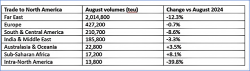 根據(jù)最新的CTS數(shù)據(jù),只有來自大洋洲和撒哈拉以南非洲的的進(jìn)口量出現(xiàn)了增長,而來自遠(yuǎn)東的跨太平洋干線的進(jìn)口量同比下降12.3%,與2024年8月相比減少約30萬TEU,這表明了美國關(guān)稅政策對今年“旺季”的影響。