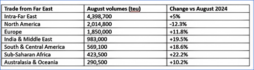 與此同時,其他市場吸收遠(yuǎn)東地區(qū)持續(xù)高出口量的能力在8月份沒有減弱的跡象,除北美外,其他航線的貨運量都呈現(xiàn)出兩位數(shù)增長。